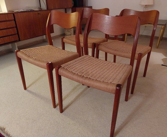 Queste sedie Niels Otto Møller della JL Møllers Møbelfabrik sono realizzate in teak con impagliatura originale. Il legno e l'impagliatura sono intatti e mostrano solo minimi segni di usura, poiché le sedie sono rimaste nello stesso appartamento da quando sono state acquistate nuove, ma sono state utilizzate pochissimo.