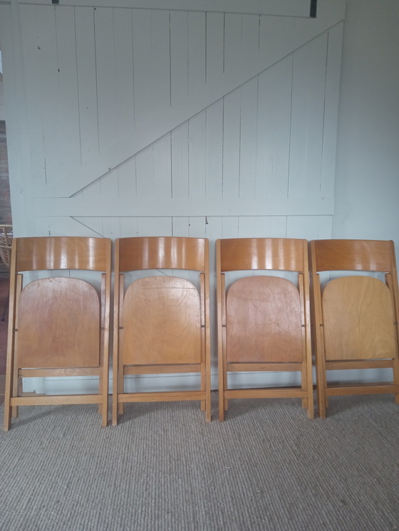 Questo set di quattro sedie pieghevoli vintage porta il fascino dello stile Mid-Century Modern nei tuoi interni. Con le loro linee pulite e la calda finitura in legno, sono funzionali ed eleganti, perfette per ogni occasione in cui siano necessari posti a sedere extra.