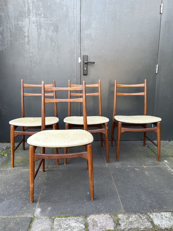 Quattro calde sedie in legno. Sono molto leggere. Il legno ha un colore caldo. Piedini con puntali in metallo. La seduta sembra fluttuare sopra le gambe anteriori. Una caratteristica non comune. Il rivestimento necessita di essere sostituito. Rifoderandole, potrete personalizzarle per adattarle al vostro stile d'arredamento. Il legno è in buone condizioni e può essere riportato al suo antico splendore con olio di teak. Un bellissimo set con un grande potenziale.