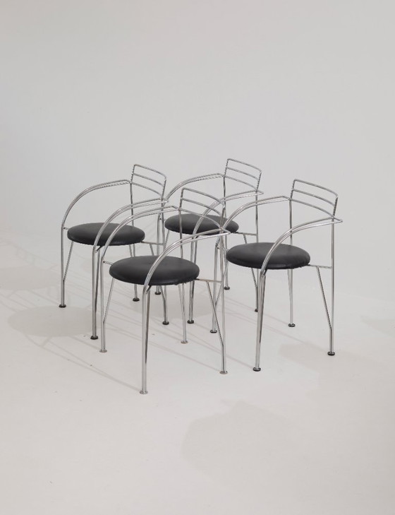 Scopri questo eccezionale set di quattro sedie "Lune d'Argent" disegnate dal famoso designer Pascal Mourgue per Fermob, risalenti al 1985. Questi pezzi vintage incarnano un'eleganza senza tempo con le loro strutture cromate lucide e le sedute in similpelle nera, offrendo un contrasto sorprendente e sofisticato.