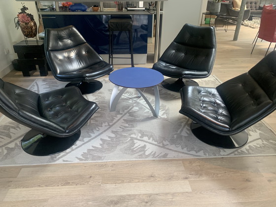 Set di quattro poltrone Artifort F510 con poggiapiedi, vendute come set completo. Realizzate in pelle nera.