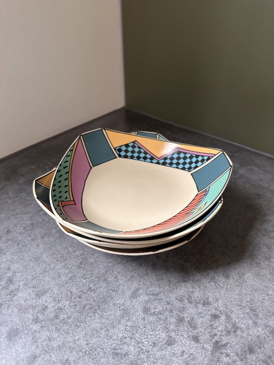 Quattro piatti fondi dell'iconica linea di stoviglie Flash, disegnata da Dorothy Hafner negli anni '80 e prodotta dalla rinomata manifattura Rosenthal in Germania. Marchiati con il marchio della fabbrica e Hafner (4x).