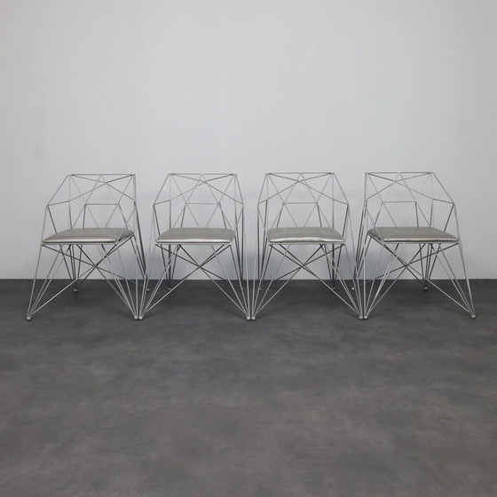 Un design scultoreo di grande impatto con una silhouette grafica e architettonica. Queste sedie hanno una struttura geometrica in filo d'argento e cuscini di seduta grigio argento lucido che ne esaltano l'aspetto futuristico. Modello raro, forse proveniente da una produzione di uno studio o di una galleria.