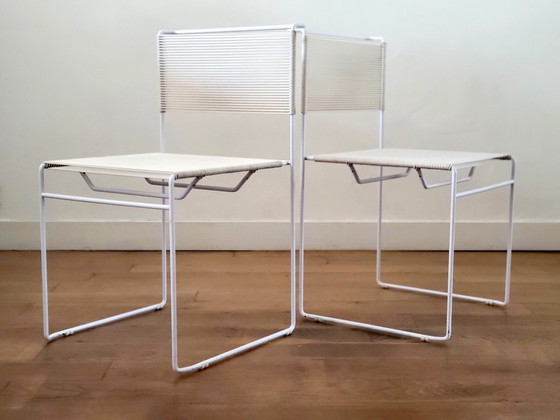 Questo set di quattro sedie vintage di Giandomenico Bellotti per Flyline Italia è una vera icona del minimalismo italiano, un perfetto mix di eleganza e giocosità. Conosciute come "sedie spaghetti" per la loro caratteristica seduta e schienale in corda di PVC, ogni sedia presenta un'elegante struttura cubica in acciaio laccato bianco. Seduta e schienale sono intrecciati a mano con corde flessibili, creando una silhouette comoda ma visivamente leggera. Il loro design arioso e la geometria pulita conferiscono loro un aspetto moderno e senza tempo. Il set di quattro sedie è in buone condizioni vintage, con lievi segni di usura coerenti con il tempo. Una sedia presenta lievi danni alla corda, ma è ancora robusta e in tensione.