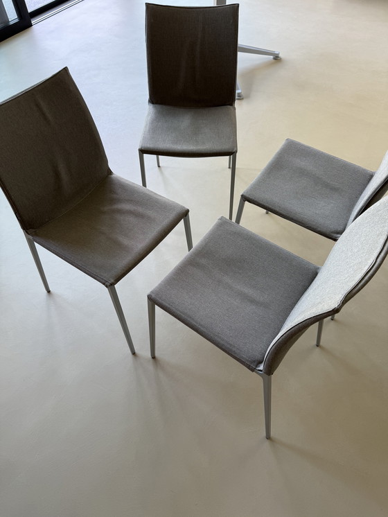 Quattro (4) sedie Zanotta Lia, seduta in tessuto grigio, gambe in metallo argentato opaco. Primo proprietario.