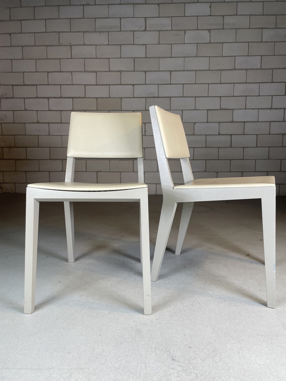 4 sedie The Vorm Wood Me. Le strutture delle Wood Me sono realizzate in pregiato rovere europeo, in questo caso verniciato grigio chiaro. La seduta e lo schienale sono realizzati in compensato e schiuma a freddo, rivestiti in pelle color crema. La sedia Vorm Wood Me è una sedia esclusiva e di alta qualità. Le sedie presentano segni di usura (soprattutto agli angoli della seduta in pelle). Vendute in set da 4. Disponibili diverse quantità.