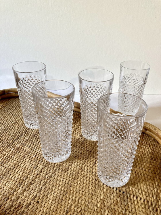 Splendido set di cinque bicchieri da limonata/aranciata, tagliati a rombi con un motivo a stella sulla base.