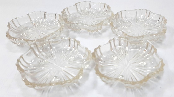 Decorati con un leggero motivo geometrico in rilievo sul fondo e sostenuti da tre piccole gambe in vetro. I piattini hanno la forma di un fiore stilizzato.