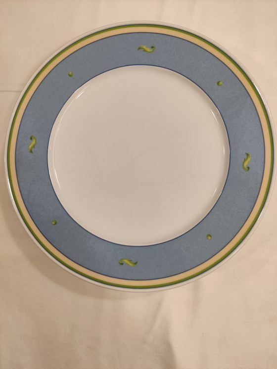 Sei piatti in porcellana della serie Viva Besco di Hutschenreuther. Bordi nei colori blu, giallo e verde. Diametro 32 cm e altezza 2,5 cm.