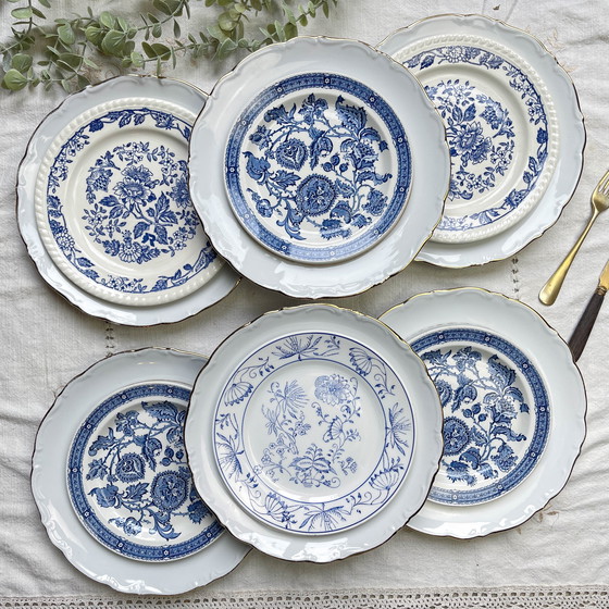 6 piatti vintage in porcellana bianca e oro + 6 piccoli piatti Ridgway giacobini blu spaiati