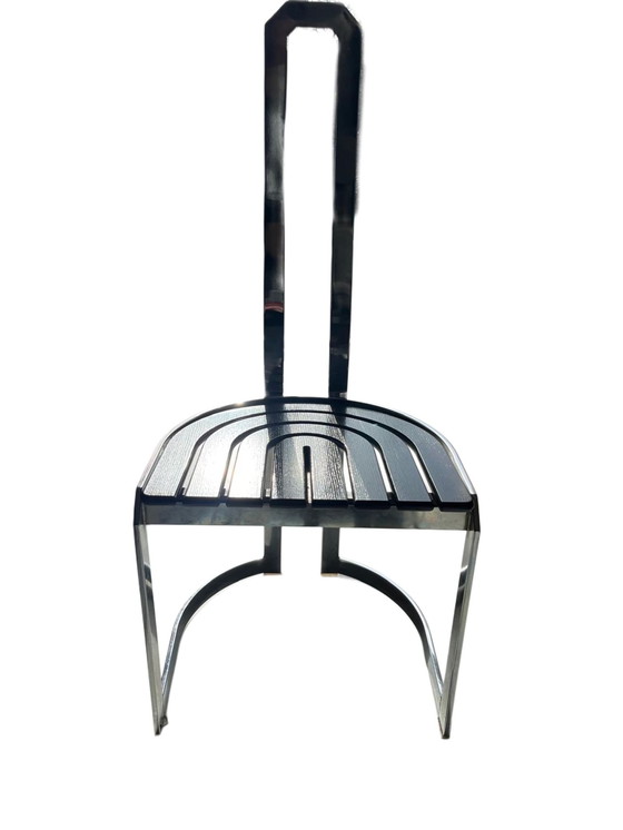 Sei sedie da pranzo Allmilmo anni '80 (stile Bauhaus Art Déco). Schienale e base cromati, seduta in frassino curvato grigio. Altezza 110 cm. Altezza seduta 44 cm. Larghezza 49 cm. Profondità 51 cm.