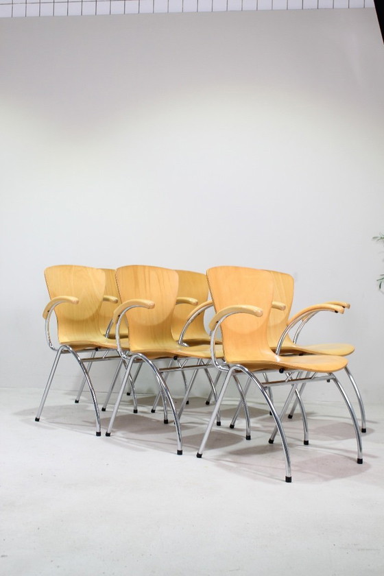 Queste sedie incredibilmente robuste sono impilabili e realizzate in compensato profilato, montate su una struttura in metallo cromato.