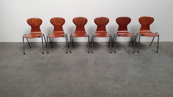 6 sedie scolastiche (6,1) resistenti e impilabili, dal design industriale, con sedute dalle linee eleganti e grafiche. Ogni sedia è quindi diversa e unica. Tutte le sedie sono fotografate singolarmente in set da 2, 4, 8 e qui da 6, ad esempio: Quindi. Quello che vedete è sicuramente quello che riceverete! Sedie vintage in Pagholz/pagwood degli anni '60, design retrò vintage. Comode da sedersi, con schienale di supporto e sedute sagomate. Modello Butterfly: sedie industriali OBO di Eromes Wijchen. Sedie scolastiche/sedia a farfalla direttamente dagli anni '60. Le sedie hanno una seduta in legno di pagwood/pagwood con struttura in metallo cromato. Impilabili e affidabili. Tutte le sedie presentano normali segni di usura dovuti al tempo. Multiuso, casa, hotel, bar, taverna, posto di lavoro, scrivania, ad esempio come sedia da ufficio, sedia da cucina, sedia da scuola, sedia a farfalla, sedia da mensa, sedia da hotel, sedia impilabile da bar. Dimensioni: modello Butterfly H82,5 x L49 x P50 Altezza seduta: 45 cm. Larghezza seduta: 40 cm.