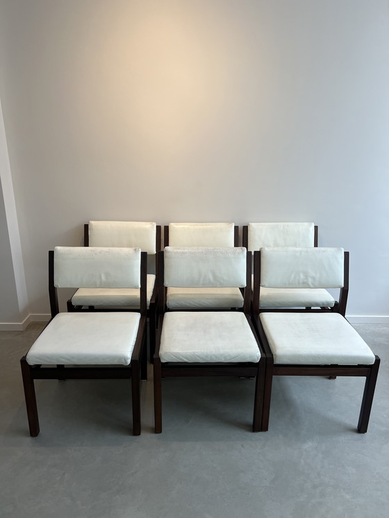 Scopri un'eleganza senza tempo con questo squisito set di sei sedie da pranzo vintage disegnate da Cees Braakman per Pastoe, parte della rinomata serie giapponese. Queste sedie presentano una suggestiva struttura in legno scuro abbinata a un rivestimento in pelle chiara, creando un contrasto sofisticato che valorizzerà qualsiasi sala da pranzo.