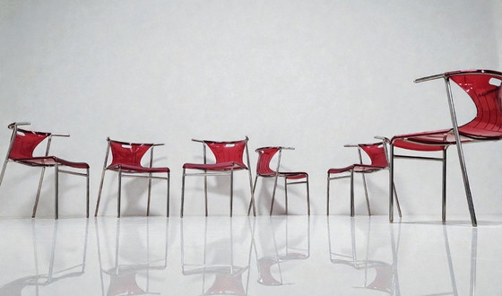 Aggiungi un tocco di colore vivace e un tocco moderno di metà secolo alla tua sala da pranzo con questo set completo di 6 sedie IKEA Elmer. Ora fuori produzione e molto ricercate, queste sedie presentano un design elegante e minimalista che bilancia il cromo industriale con una finitura rosso trasparente lucido.