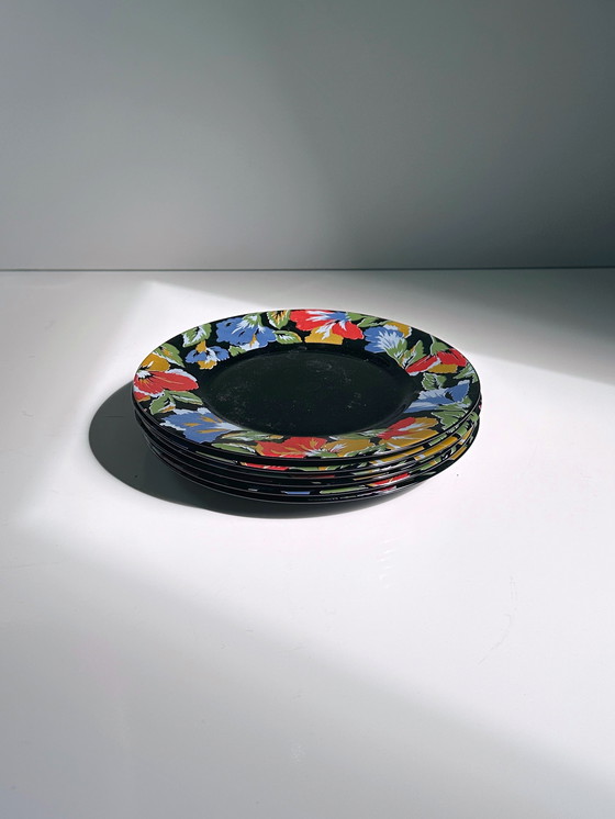 6x Piatti da torta vintage Arcoroc Fiori neri Francia Set anni '80-'90 Luminarc Octime Francia Rosso Blu Giallo