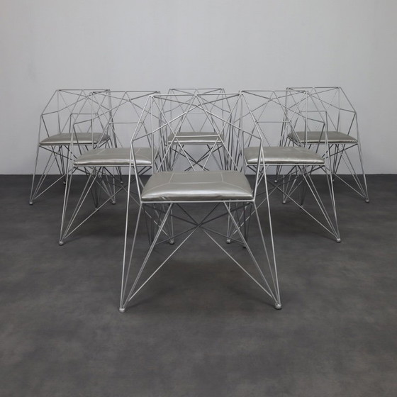 Un design scultoreo di grande impatto con una silhouette grafica e architettonica. Queste sedie presentano una struttura geometrica in filo metallico di colore argento e cuscini di seduta in argento/grigio lucido che ne esaltano l'aspetto futuristico. Modello raro, forse proveniente da una produzione di uno studio o di una galleria.