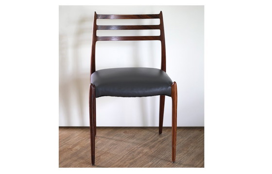 Set di sei sedie modello '78' disegnate da Niels Otto Møller per JL Møllers Møbelfabrik in Danimarca. Anni '60. Le sedie sono state rivestite in pelle grigio/nera. In buone condizioni vintage.