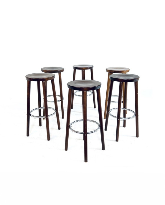 Set di 6 sgabelli da bar vintage in stile brutalista, realizzati in Germania negli anni '70. Un bellissimo set di sgabelli da bar in rovere massello con un anello cromato come poggiapiedi. Questi sgabelli antivandalismo sono molto stabili e indistruttibili. Bellissimi sgabelli in stile brutalista. Stanno benissimo in un negozio, bar, ristorante o a casa, sull'isola della cucina. In buone condizioni. Dimensioni: altezza 75 cm, diametro 35 cm, poggiapiedi 29 cm.