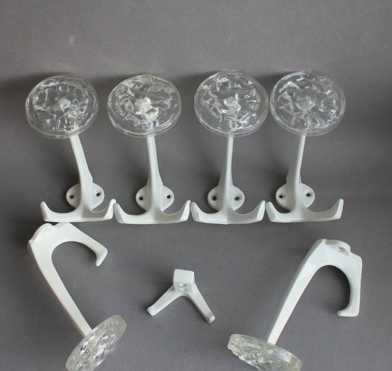 7 appendiabiti vintage di metà secolo, design anni '70, in metallo e plastica trasparente