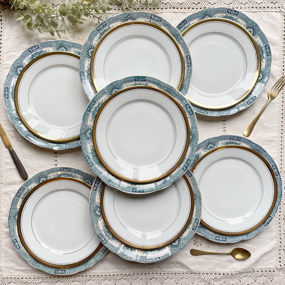 7 piatti in pietra di ferro blu Onnaing + 7 piccoli piatti in porcellana di Limoges spaiati