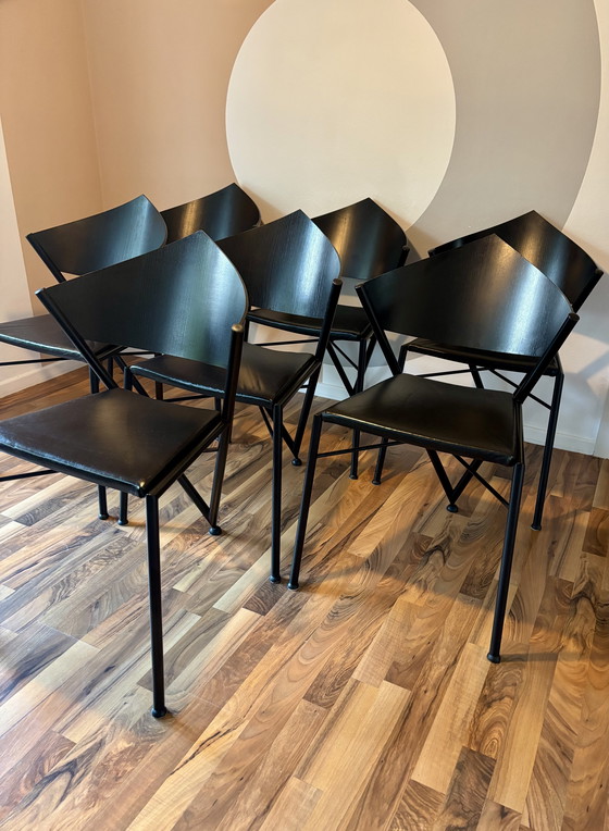 Set di sette sedie con struttura in acciaio verniciato a polvere nero, schienale in legno curvato e seduta nera liscia. Il modello è conosciuto con il nome di "Victory" ed è spesso attribuito al produttore tedesco D-tec degli anni '80-'90. Il design presenta le caratteristiche tipiche dello stile postmoderno Memphis.