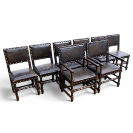 CondizioneBuonoColoriMarroneMaterialeLegno, PelleNumero di articoli8Altezza93 cmLarghezza44 cmProfondità45 cmAltezza del sedile45 cmSegni di utilizzoAmmaccature, Crepa, Graffi, Rughe