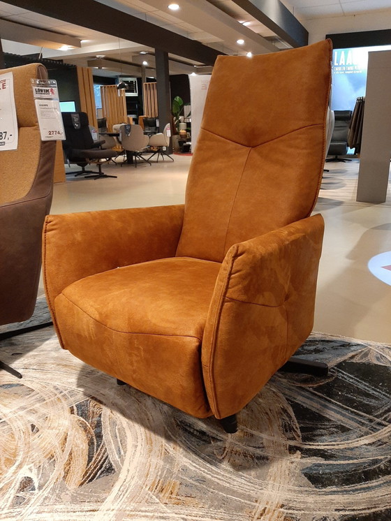**MODELLO DA SHOWROOM** La poltrona relax 9920 della collezione Himolla è realizzata in micropelle color cognac ed è regolabile manualmente.