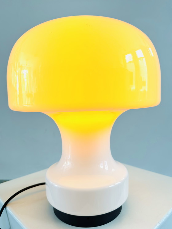 Fondata nel 1945 dal Dr. Walter Heinrich, Glashütte Limburg (originariamente Glasshüttenwerke Limburg GmbH) divenne rapidamente nota per la sua illuminazione in vetro di alta qualità. Questa iconica lampada a forma di fungo, prodotta negli anni '70, è caratterizzata da un bellissimo paralume in vetro opalino che diffonde una calda luce ambientale, perfetta per creare un'atmosfera accogliente in qualsiasi spazio.