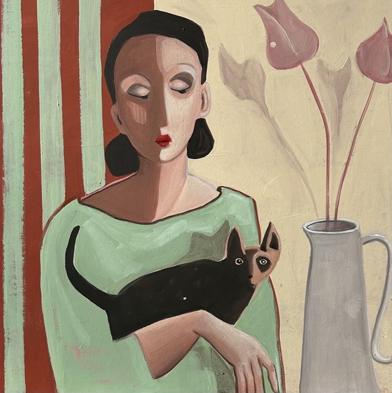 Quadro acrilico con cornice, sotto vetro. Questo affascinante dipinto, intitolato "A casa", offre uno sguardo sereno su un momento di tranquillità e compagnia. L'opera presenta una donna in posa contemplativa, che culla un gatto, su uno sfondo di colori tenui e sfumati che evocano un senso di calma e introspezione. L'uso di pennellate delicate e l'armoniosa tavolozza di colori dell'artista creano un'atmosfera rilassante, rendendo l'opera ideale per qualsiasi spazio abitativo.