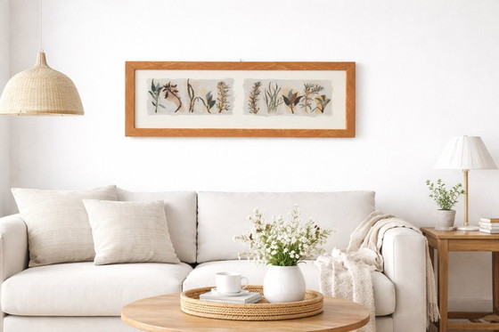 La composizione è presentata in un raffinato formato panoramico, con tenui toni naturali e pennellate espressive tipiche dell'illustrazione botanica di fine XX secolo.