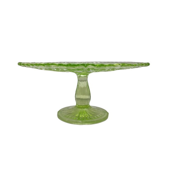 Alzata per torta in vetro all'uranio, unica e rara. Questa alzata per torta è splendidamente fusa e di buone dimensioni. La vetreria all'uranio fu prodotta in grandi quantità dal 1870 al 1940. Questa alzata risale agli anni '40 ed è stata realizzata in Francia. È in perfette condizioni. Dimensioni: 24 x 10,5 cm (L x A). N. 6893