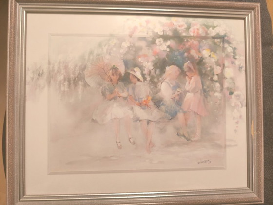 Quest'opera raffigura quattro giovani ragazze sedute su uno sfondo fiorito. Si dispongono in coppia e sembrano esaminare i fiori che raccolgono dai cespugli. È una serigrafia in ottime condizioni. Presenta qualche piccolo danno alla cornice, ma nulla di grave. È un'opera firmata. 34x28 cm