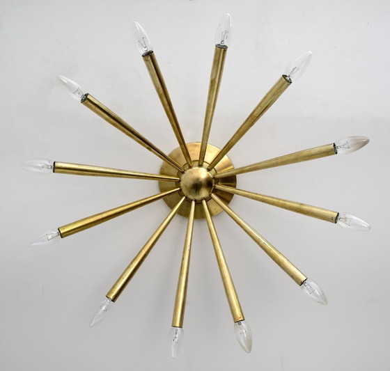 Lampada da parete di Angelo Lelli per Arredoluce. Disegnata e prodotta in Italia, circa anni '50. In ottone. Possiamo inserire riduttori per lampadine USA, lampade E14 attuali.