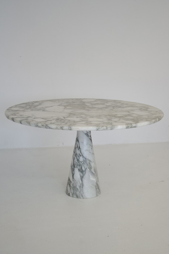Tavolo da pranzo in marmo Angelo Mangiarotti modello M1, disegnato per T70 nel 1969 e prodotto da Skipper in Italia. Struttura in due parti composta da un piano rotondo spesso 3 cm e da una base tornita. Dimensioni: diametro 130 cm / altezza 72 cm.