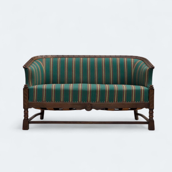 Anni '50, divano danese a 2 posti, lana per mobili verde, legno di quercia.