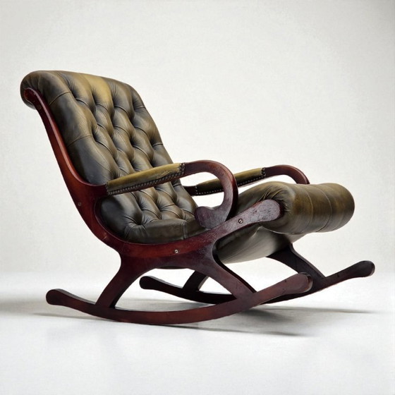 Anni '50, sedia a dondolo Chesterfield, pelle verde originale, legno di teak.