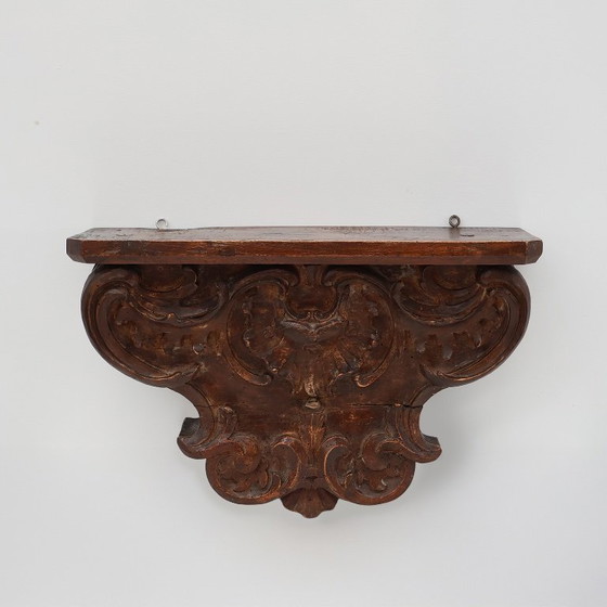 Decorazione architettonica in legno massello della metà del XIX secolo, in Francia. La consolle presenta un piccolo ripiano con una ricca decorazione intagliata nella parte inferiore. Questo pezzo, realizzato a mano, presenta una splendida patina e alcuni fori di tarli nel legno antico e trattato.