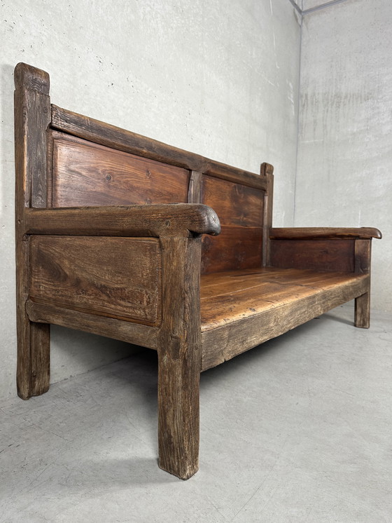 Antica panca spagnola in legno (da frutta), XIX secolo. Design minimalista. Realizzato artigianalmente. Composta da 1 pezzo. Schienale alto e seduta profonda. Bella patina. Stabile e stabile. Viene fornito con un set di cuscini completamente personalizzato. Il tessuto della seduta (con cerniera) è ancora buono, ma presenta alcune macchie qua e là... quindi è possibile pulirlo a secco o sostituirlo con un nuovo tessuto.
