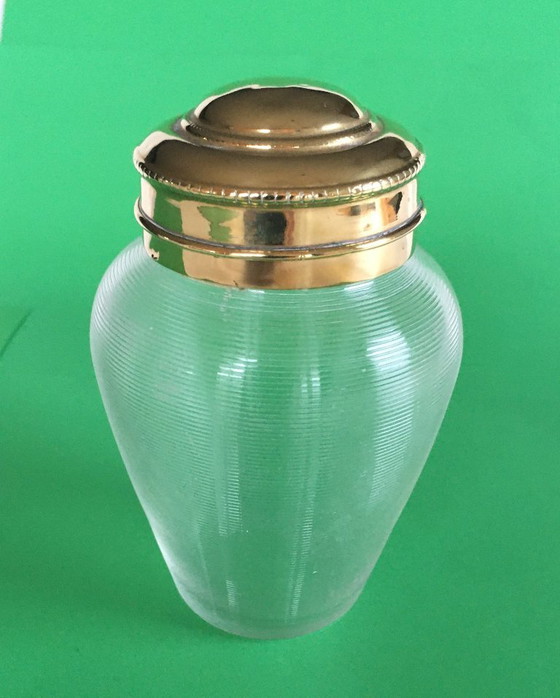 Splendido vaso da tè, noto anche come "caddy", con coperchio in ottone a chiusura ermetica. Vetro retinato frisone con nervature orizzontali e semitrasparente. Il vaso risale al 1900 circa.