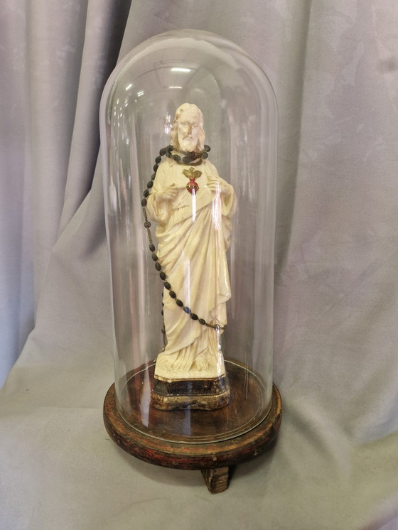Questa bellissima scultura religiosa antica di Gesù, accuratamente collocata sotto una campana di vetro, emana una bellezza senza tempo. La scultura, con la sua espressione serena e le sue finiture dettagliate, invita alla contemplazione e all'ammirazione.
