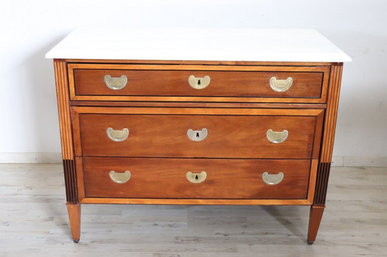 Realizzato in noce pregiato dalla tonalità chiara, la sua linearità riflette perfettamente il gusto dell'epoca, che ricercava la perfezione attraverso un'estrema eleganza e raffinatezza, spesso con l'assenza di decorazioni eccessive. Alcuni dettagli più scuri creano un contrasto visivo di grande effetto, con un curioso tocco di modernità. Il piano in marmo bianco esalta la grazia di questo pezzo. Dal punto di vista funzionale, presenta tre comodi cassetti. Si può certamente pensare di collocare questa preziosa cassettiera in qualsiasi stanza della casa e di valorizzarla abbinandola a un bel quadro o a un bello specchio. Ovunque decidiate di collocarla, diventerà un punto focale, ammirato e invidiato da tutti i vostri ospiti. La sua elegante semplicità lo rende inoltre perfetto per un arredamento sia classico che moderno.