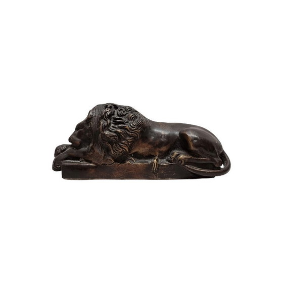 Antico leone in bronzo di Antonio Canova, risalente alla fine del XIX secolo. Questa splendida scultura stilizzata raffigurante un leone addormentato è basata su un'opera dell'artista italiano Antonio Canova. È realizzata in bronzo fuso cavo, riempito di cemento.