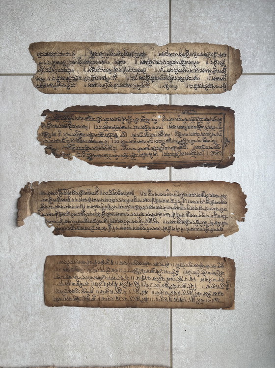 Quattro frammenti di un antico manoscritto tibetano, probabilmente risalenti al XVIII o XIX secolo.