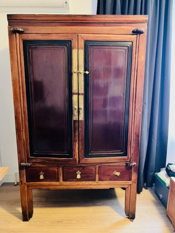 Antico mobile cinese a due ante con ferramenta tradizionale. All'interno di ogni anta si trova un ripiano divisorio con un ampio cassetto. Sotto le ante si trovano tre cassetti profondi. Il mobile presenta qualche segno di usura, tipico dei mobili antichi. È incluso un certificato. Il mobile può essere ritirato a Voorburg.