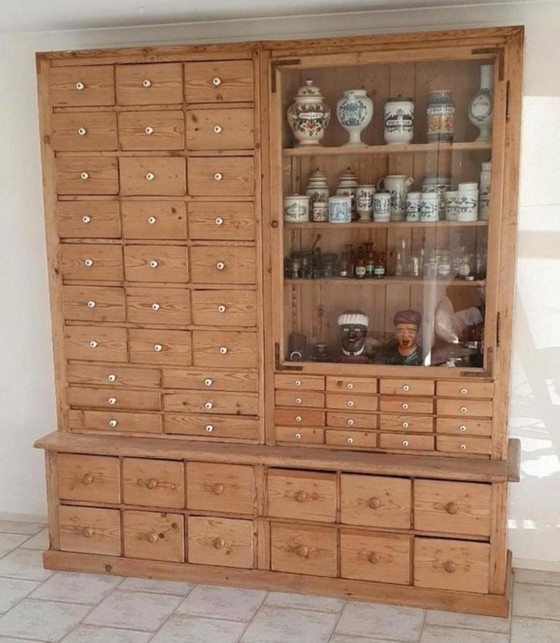 Questa antica credenza da farmacia della Germania dell'Est è un meraviglioso esempio di artigianato e storia. Con la sua robusta struttura in legno e la vetrina in vetro, offre non solo funzionalità, ma anche un'aggiunta esteticamente gradevole al vostro arredamento. È ideale per esporre oggetti da collezione o riporre vari oggetti nei suoi numerosi cassetti. Aggiungete un tocco di storia unico alla vostra casa o alla vostra attività con questa splendida credenza da farmacia.