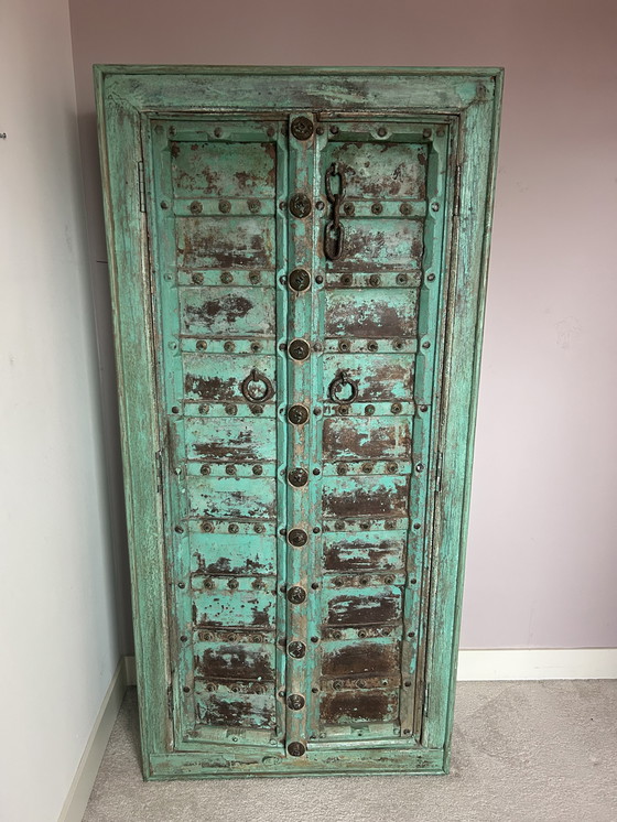 Questo mobiletto è realizzato con autentiche ante a battente provenienti da un monastero/tempio. Il bellissimo legno di acacia presenta una patina antica, che gli conferisce un aspetto puro e grezzo. L'interno è leggermente più recente. Questo antico mobiletto indiano ha molto carattere ed è una splendida aggiunta sia agli interni moderni che a quelli classici!