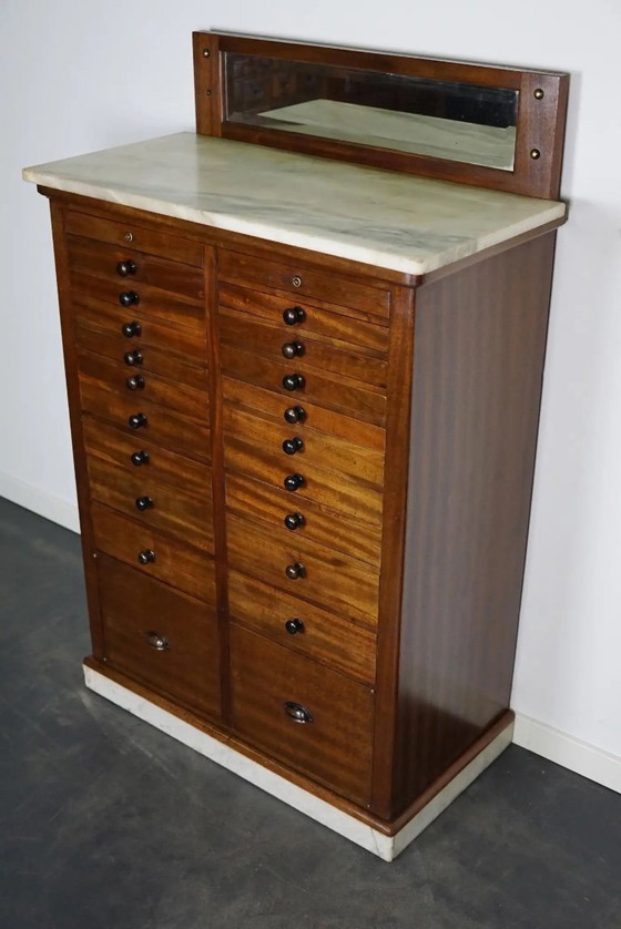 Questo esclusivo mobiletto da dentista è stato progettato e realizzato ad Amsterdam, nei Paesi Bassi, intorno al 1920-1930. Dispone di 18 cassetti con frontali in mogano in tre diverse dimensioni: 28 cm di profondità, 29 cm di larghezza e 2,5/4/8 cm di altezza. Presenta inoltre due ante, uno specchio anticato, un piano in marmo e uno zoccolo in marmo. Lo zoccolo ha subito alcuni danni ed è stato parzialmente restaurato. Il mobiletto veniva utilizzato per riporre materiali e strumenti odontoiatrici. Alcuni cassetti hanno il fondo in vetro satinato o trasparente, mentre altri sono (ri)fatti in legno. Il sistema di chiusura originale a scomparsa dei cassetti è ancora presente e in gran parte funzionante, sebbene non del tutto perfetto.