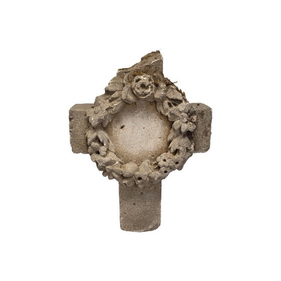 Antico ornamento funebre francese in pietra arenaria, della prima metà del XX secolo. Ornamento decorativo per tomba in arenaria raffigurante una croce con ghirlanda di fiori. Non può stare in piedi da solo.