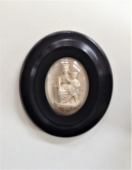 Una splendida e rara reliquia francese di Napoleone, raffigurante un'immagine splendidamente dettagliata della Vergine Maria con il Bambino Gesù in grembo. Realizzata nel XIX secolo in schiuma di mare, schiuma di mare e argilla da pipa, è inserita in una cornice di legno nero sotto un vetro antico convesso originale. È in eccellenti condizioni vintage, con solo pochi segni di usura appena visibili (vedi foto). Il retro reca un antico sigillo francese datato 16 luglio 1879, di un precedente proprietario (vedi foto). Dimensioni dell'intero oggetto (cornice inclusa): Larghezza 11,5 cm, Altezza 13 cm, Profondità 2 cm. Per ulteriori informazioni o foto, non esitate a contattarmi.